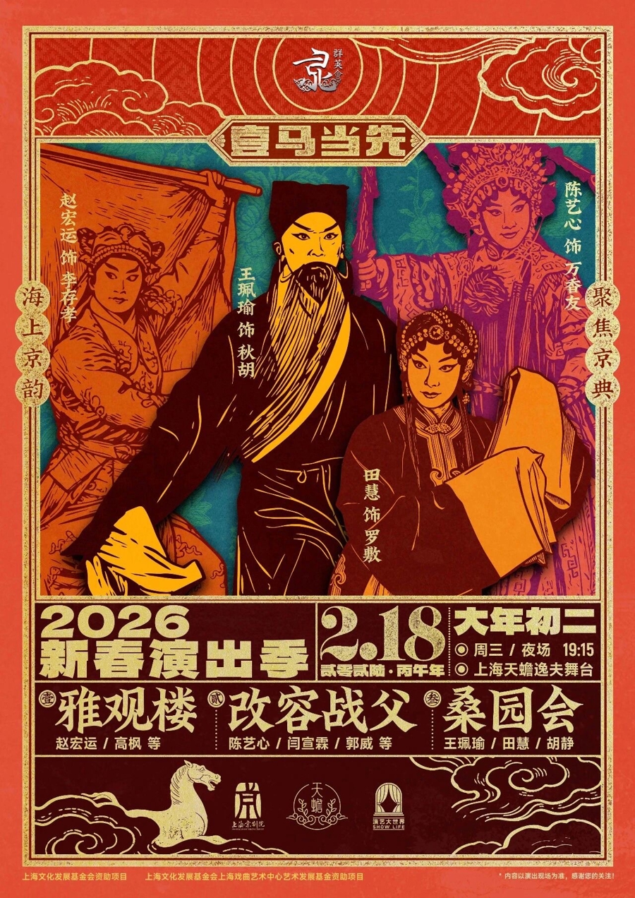 歲啟丙午,馬年迎春。2026年春節,上海各大劇院好戲連臺。上海大劇院、上海東方藝術中心、凱迪拉克·上海音樂廳、捷豹上海交響音樂廳、天蟾逸夫舞臺、上海文化廣場、宛平劇院、九棵樹(上海)將來藝術中心等文藝地標全線發力,百余場佳構上演涵蓋音樂跳舞、戲劇話劇、傳統戲曲、笑劇脫口秀,構建全齡秘密、全城聯動、全場景合并的新春文藝生態,以文商旅翻新形式激活沐日經濟,讓“看上演、過大年”成為申城新年俗。