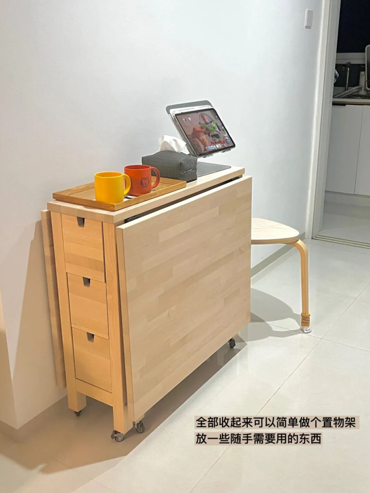 折疊餐桌還能一桌多用,合起來的時(shí)候,不錯(cuò)當(dāng)茶幾,放零食、雜志、遙控器。張開一半,能當(dāng)孩子的學(xué)習(xí)桌,孩子寫功課,大東說念主在傍邊看書、辦公。