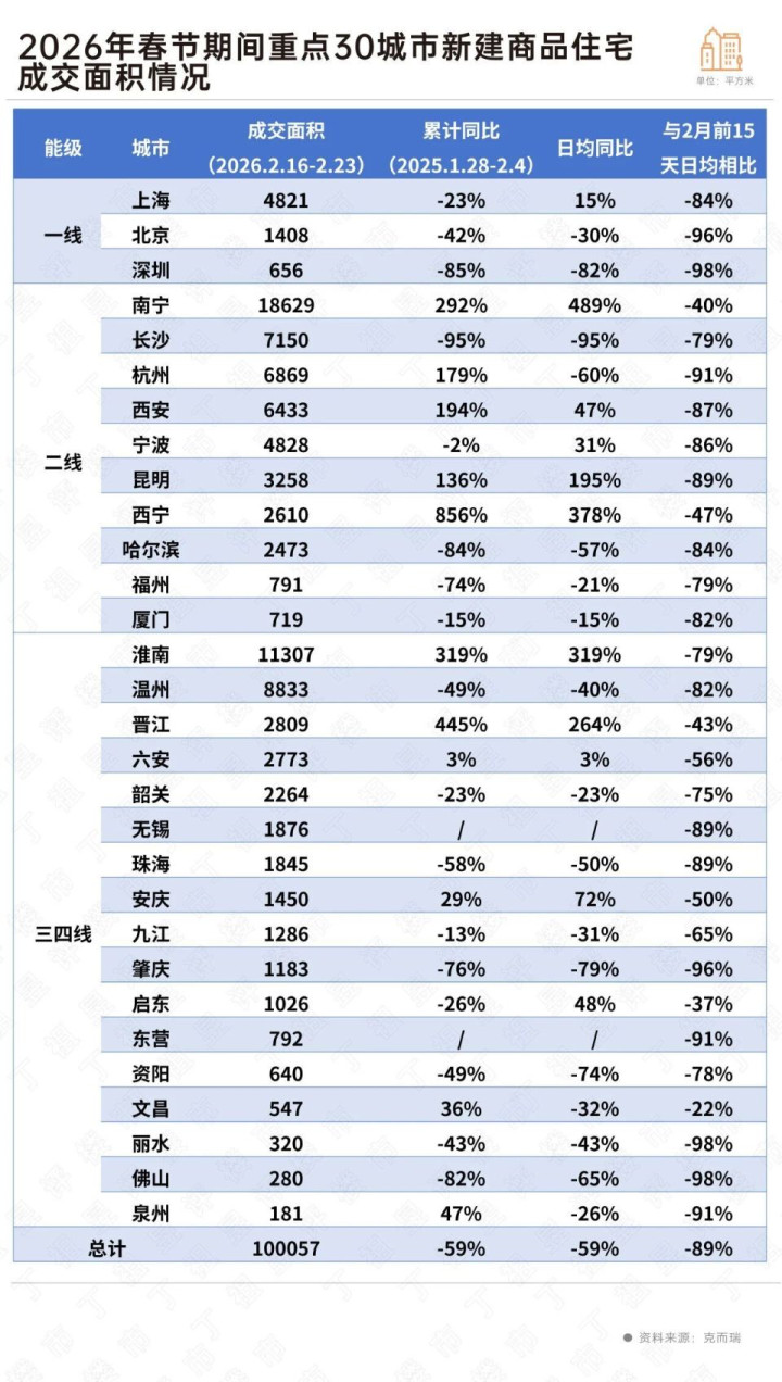 受假期網簽蔓延和阛阓調度雙重影響,克而瑞數據線路,春節時刻重心30城新建商品住宅成交面積約10萬平方米,較客歲春節假期(8天)累計成交暴減59%,比擬本年節前2月前15天日均成交面積相同減少89%。