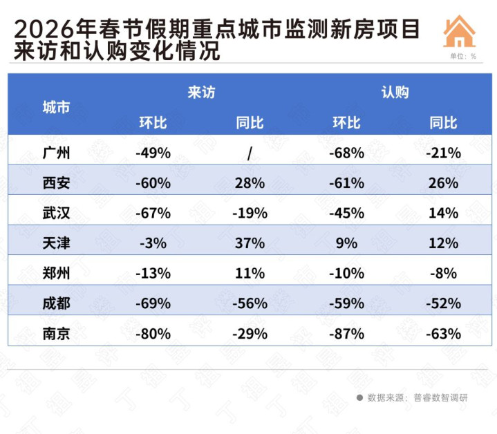 從普睿數智城市機構調研數據來看,春節時刻(2.15-2.23,下同)重心監測技倆案場來訪量和認購量同步縮減,更多為存量客戶復看、認購或成交。三四線返鄉置業再次缺席。