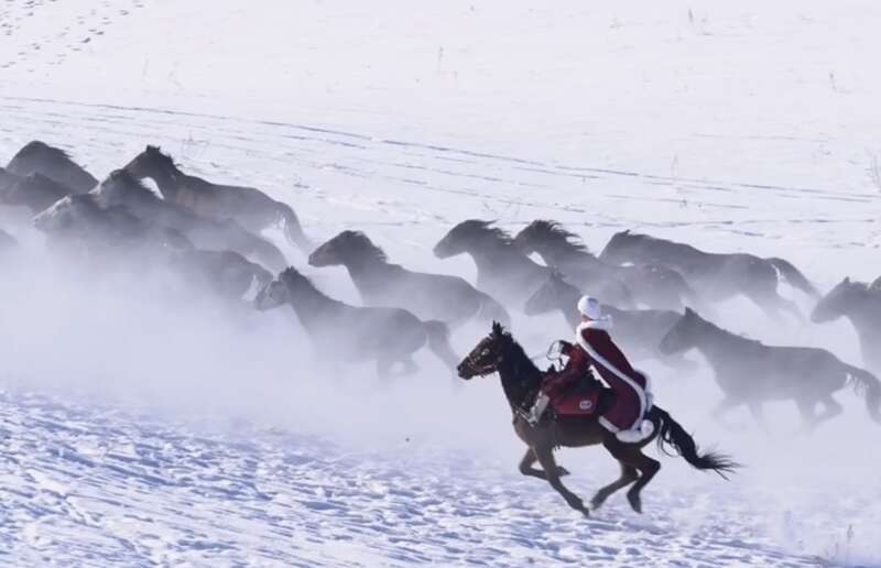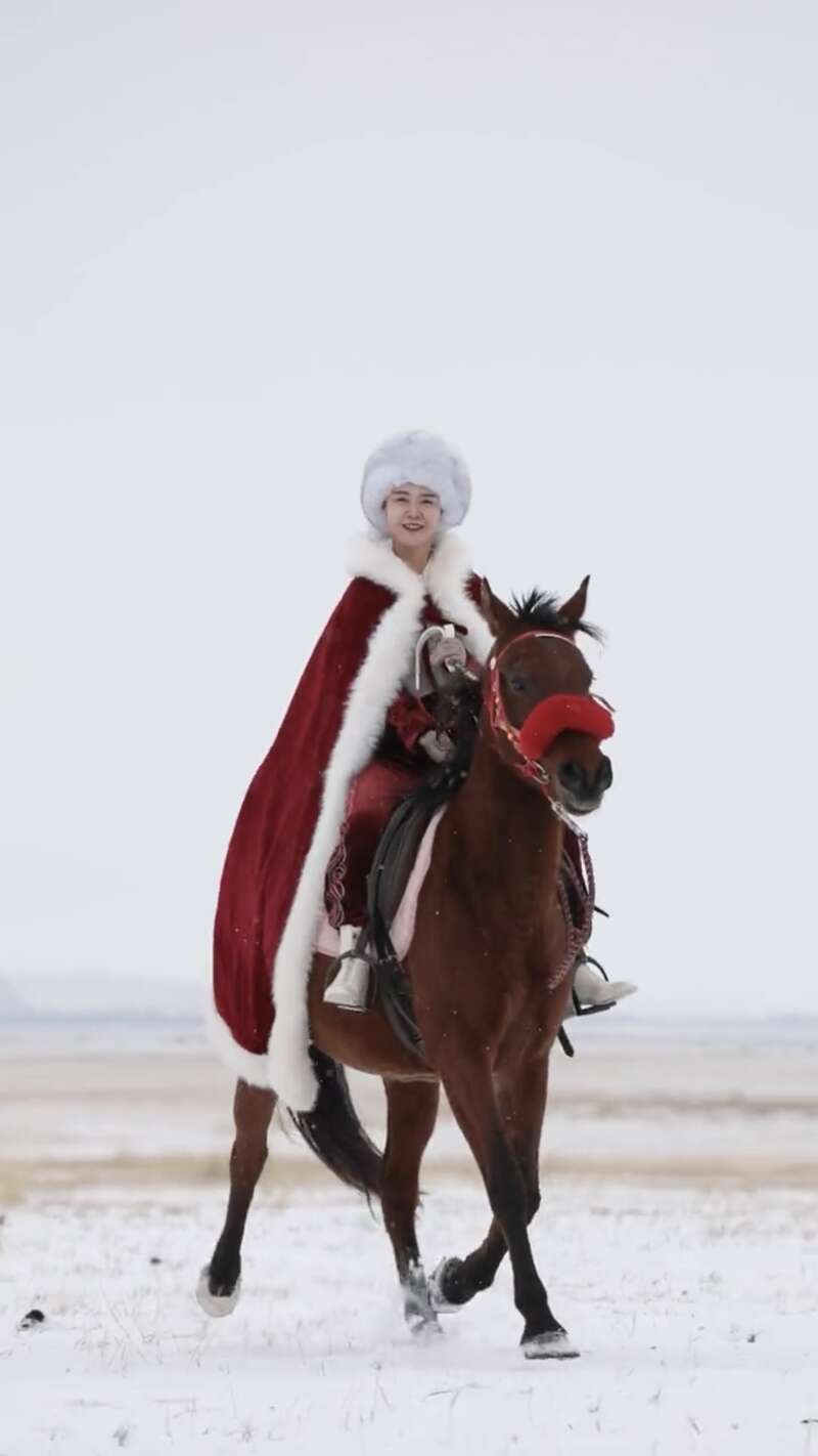 2026年元旦該賬號發布的第一條視頻,畫面中依然是在鮮明白雪中騎馬奔突的賀嬌龍,視頻配文:保捏馬束縛蹄的勁頭,一皆為夢思慷慨、為幸福打拼。