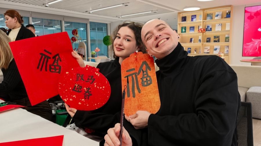 會客廳的軒敞空間里,墨香褭褭。外洋友東談主們在書道協會磨真金不怕火的用心帶領下,提筆揮毫寫下“?!迸c“馬”。來自東華大學的白俄羅斯留學生柏伊靈除了寫下一張“福”字,還和來自烏克蘭的馬克斯統共照著咖啡杯上的漢字寫下“躍馬迎春”幾個大字,然后興盛腸和我方的書道作品合影。柏伊靈的好幾個春節王人在上海渡過,知談中國的春節有合家團圓、給小孩發紅包的習俗,有些東談主還會去寺廟道喜。本年,她將繼續在上海過年,問及春節安排,她說:“我會和一又友統共約會吃飯,設想去寺廟道喜,還念念去豫園看燈?!?/p>