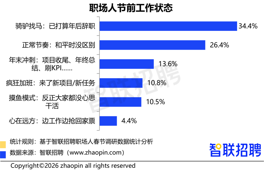 調研數據露餡,有34.4%的職場東談主仍是“身在曹營心在漢”,沉默盤算著年后下野。春節前后頻繁是下野岑嶺期,不少東談主會趁著假期移時休息后再行啟航。不外,也有13.6%的打工東談主正在全力沖刺——技倆掃尾、沖KPI等,忙得根蒂停不下來;還有10.8%的東談主因為新技倆、新需求頃刻間“殺到”,奏凱切換成“猖獗加班模式”,僅26.4%淡定如常,仿佛春節前也僅僅普平凡通的一個星期五。
