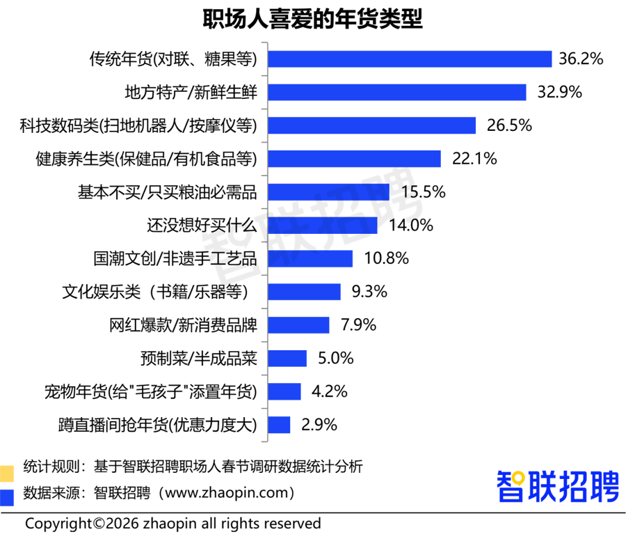 在年貨棄取上,36.2%的職場東談主將傳統年貨(對子、福字、糖果等)列為首選,突顯對傳統文化的認可與信守,貼福字、備年貨的慶典感,仍是打工東談主心中“過年該有的樣子”。同期,32.9%的東談主傾向棄取場地特產、簇新生鮮,大除夜飯品性、純碎好意思食受到越來越多東談主的追捧;另有26.5%的東談主會選購科技數碼類居品(如智妙腕表、推拿儀等),既可為長者奉上貼心關懷,也能犒勞我方。