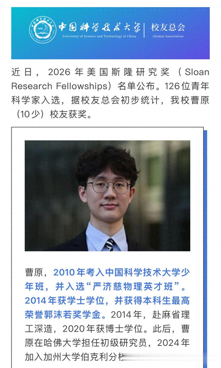 近日,2026 年好意思國斯隆扣問獎名單講求公布,大家 126 位后生科學(xué)家入選。其中,中科大少年班學(xué)友、加州大學(xué)伯克利分校講授曹原昭著在列,再次讓宇宙看到了中國后生科學(xué)家的力量。